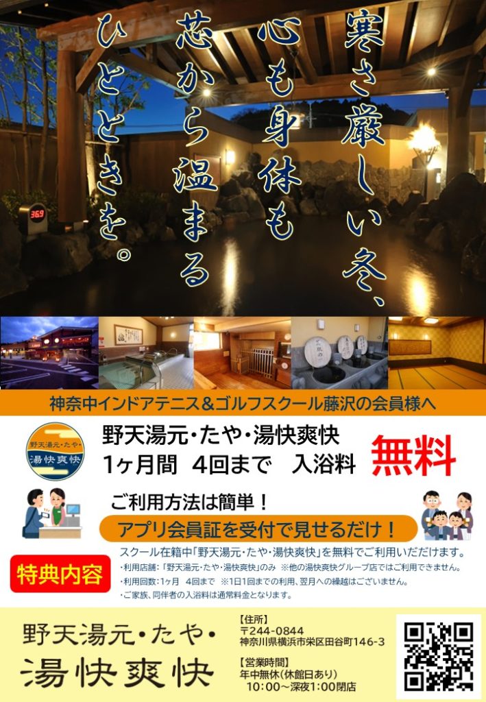スクール会員様限定!新サービススタート!弊社温浴施設「野天湯元・たや・湯快爽快」毎月、4回まで入浴料無料♨