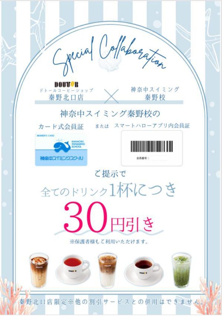 【スイミング秦野】プールに来たらほっと一息、ドトールコーヒー秦野北口店さんドリンク30円引き