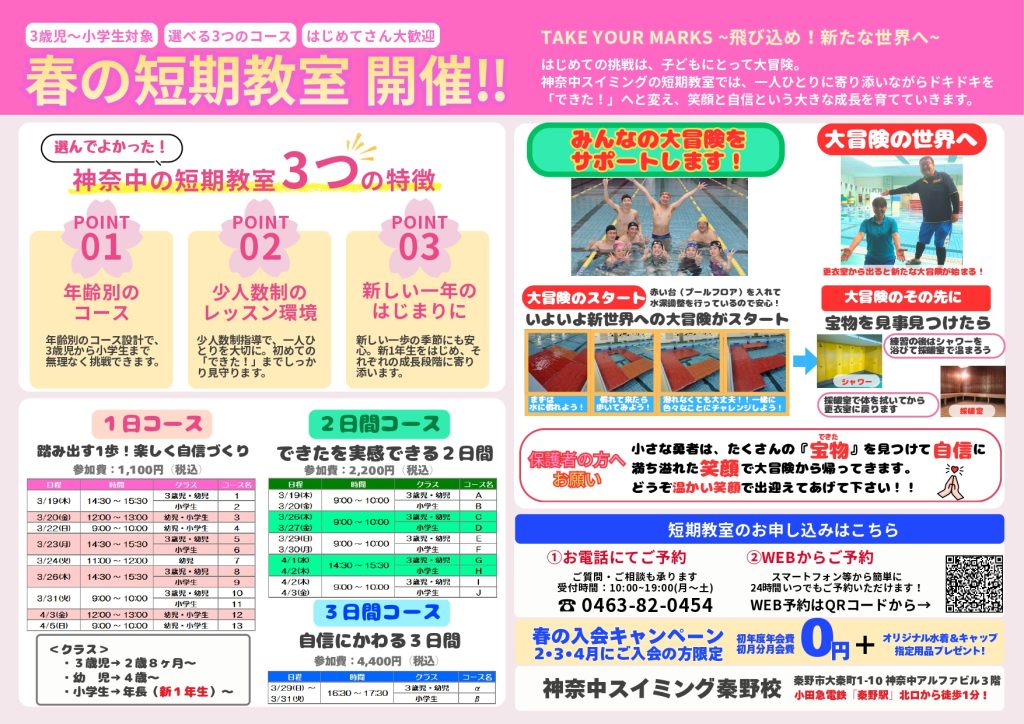 【スイミング秦野・子どもクラス】お子様の成長のきっかけに、春休み短期教室受付中!!