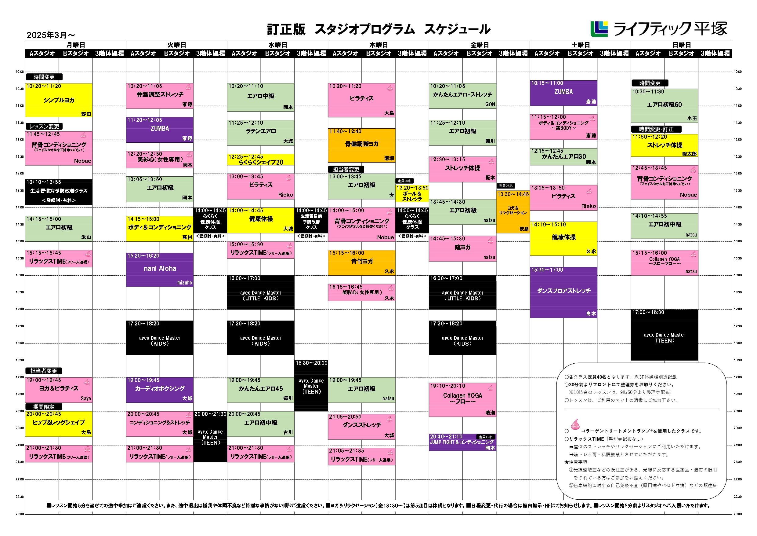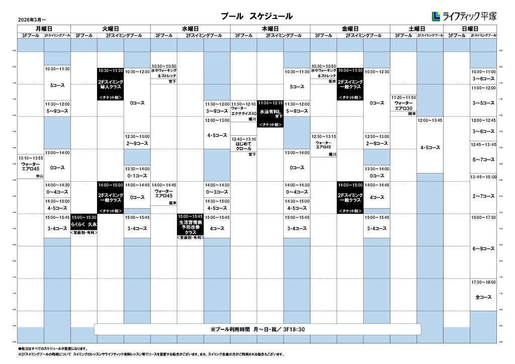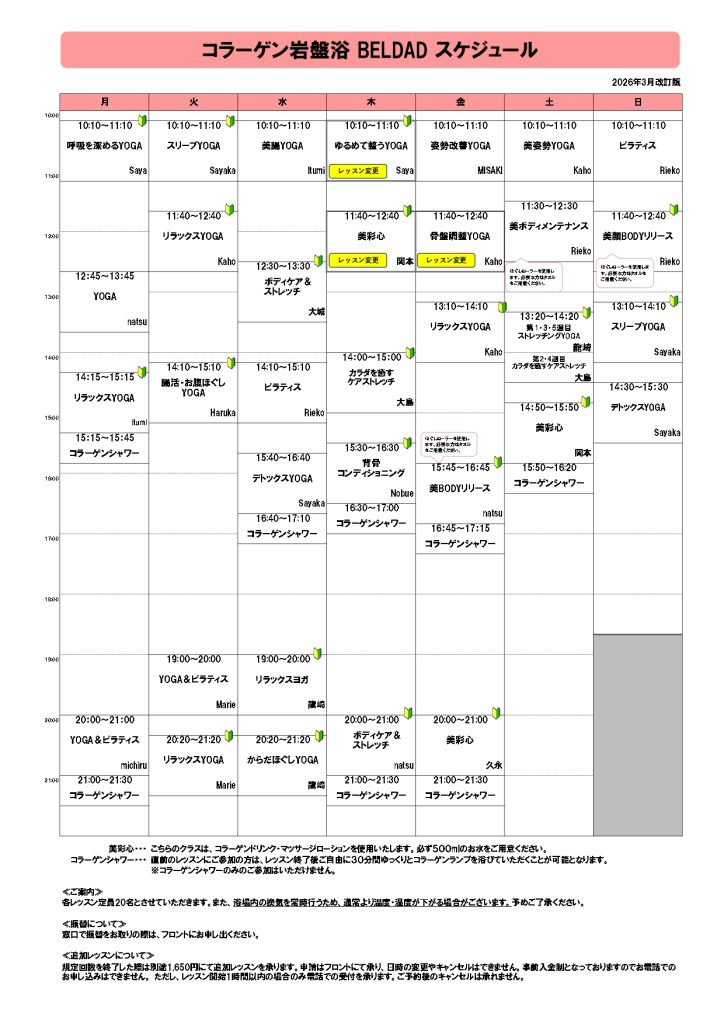 スケジュール レッスンスケジュール PDFダウンロード スタジオスケジュール プールスケジュール 岩盤浴BELDADスケジュール プログラム紹介 PDFダウンロード スタジオ内容 プール内容 休館日 お問合せはこちら