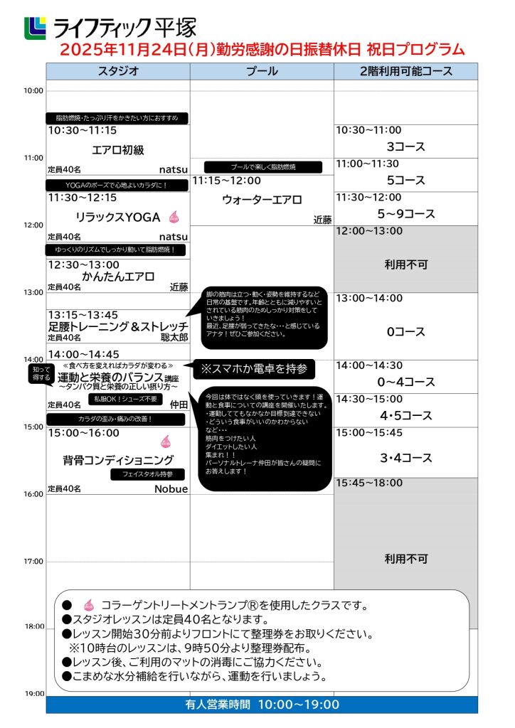 2025年11月24日(月)勤労感謝の日祝日スタジオ・プールスケジュール