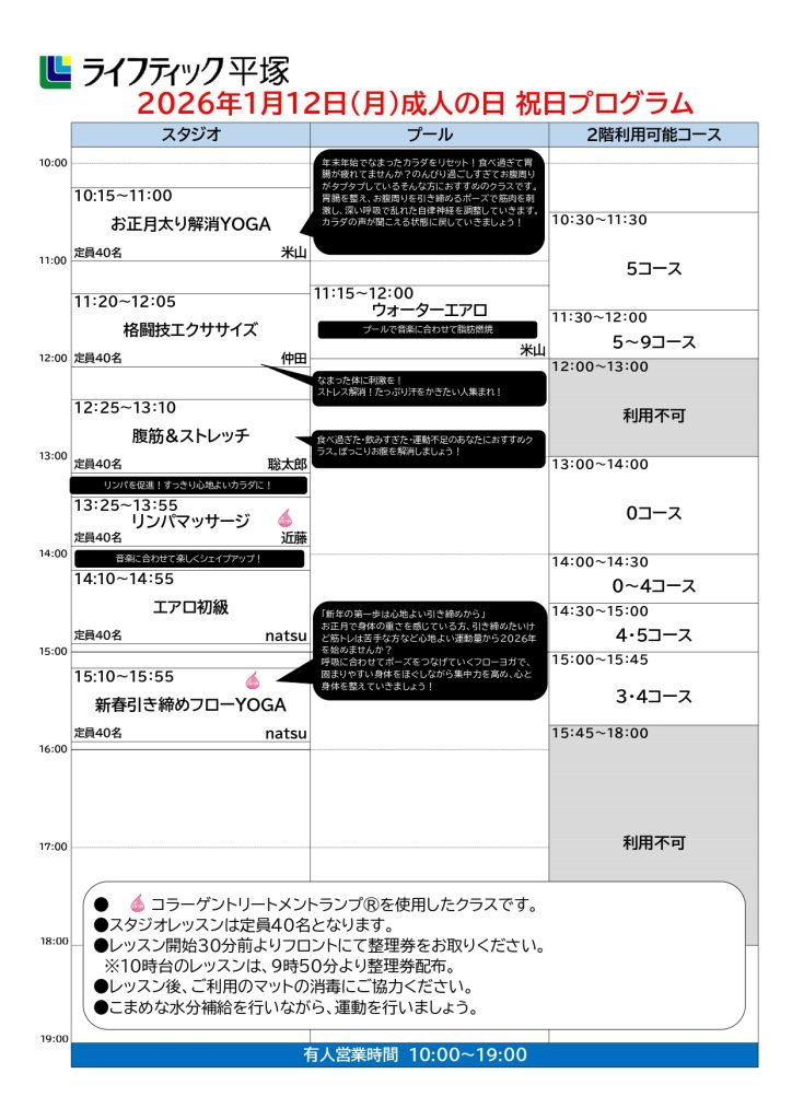 2026年1月12日(月)成人の日祝日スタジオ・プールスケジュール