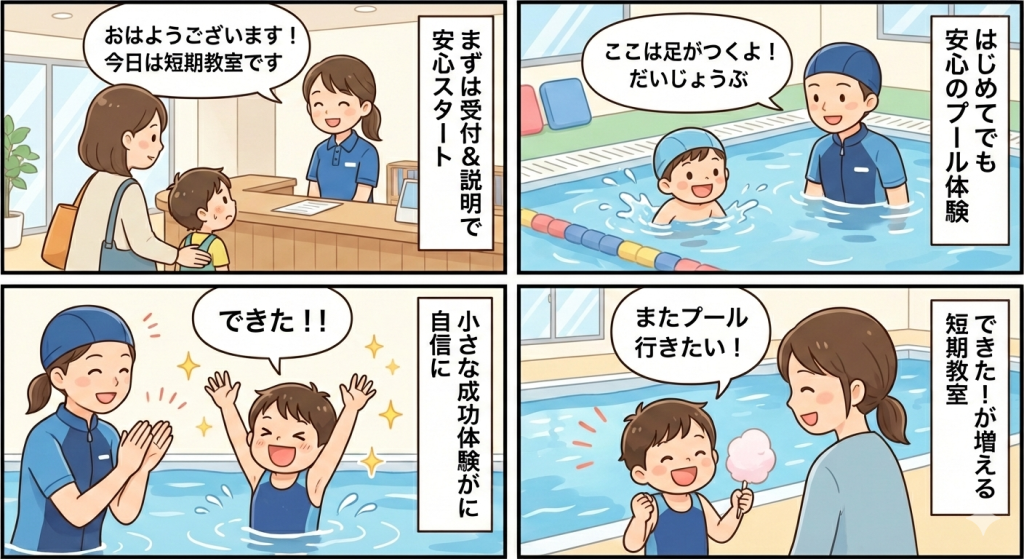 小さな「できた!」を積み重ねて、自信と笑顔を育てる短期水泳教室です。