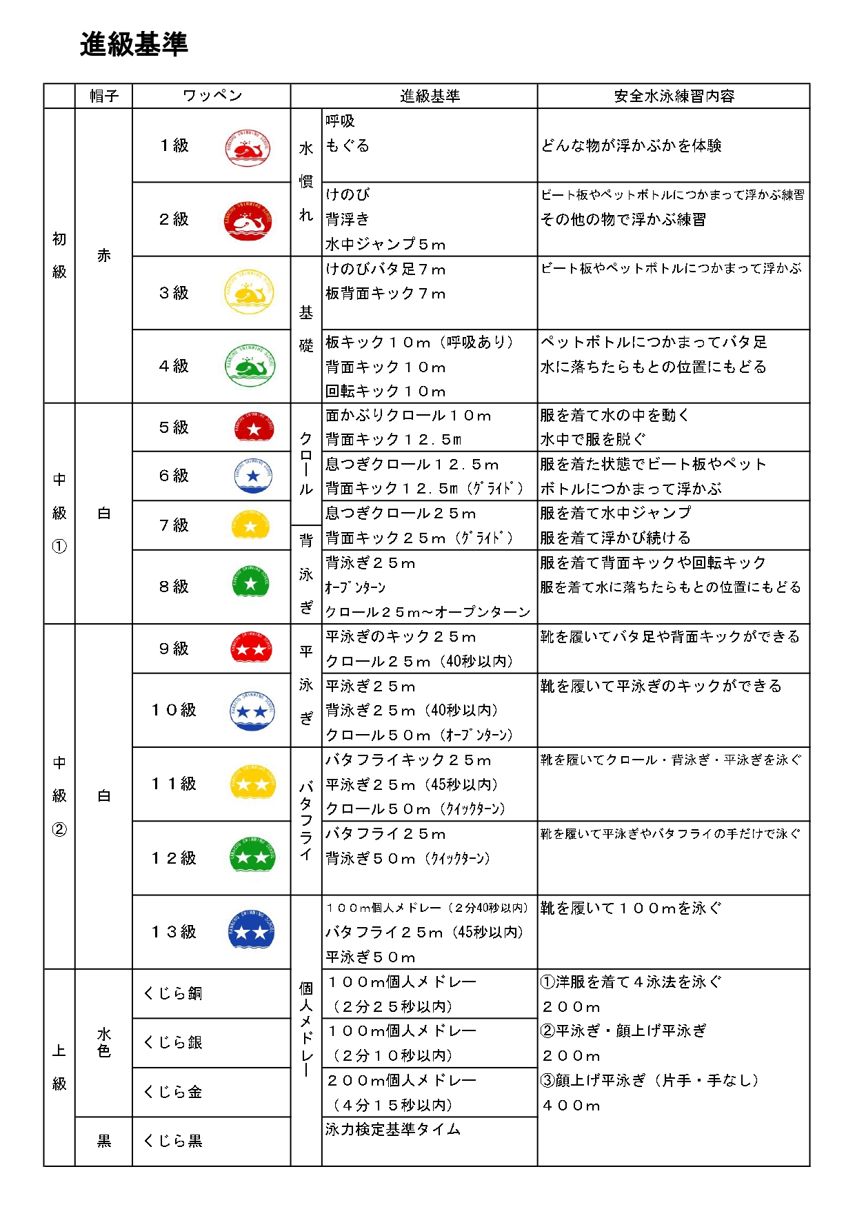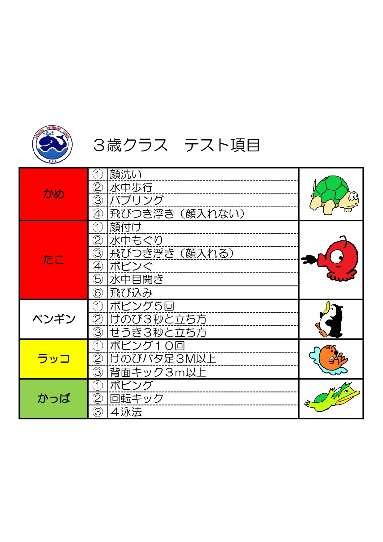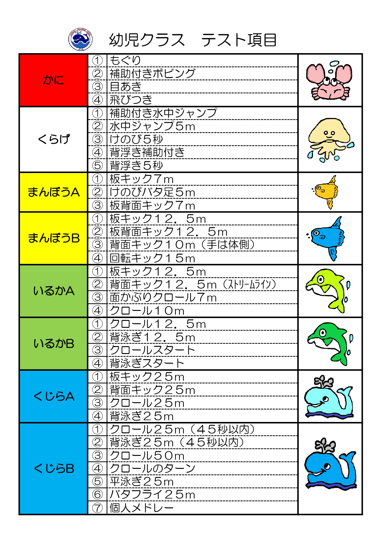 - 「水に慣れる」から「クロールや背泳ぎができる」まで、レベルごとに5クラスがあります