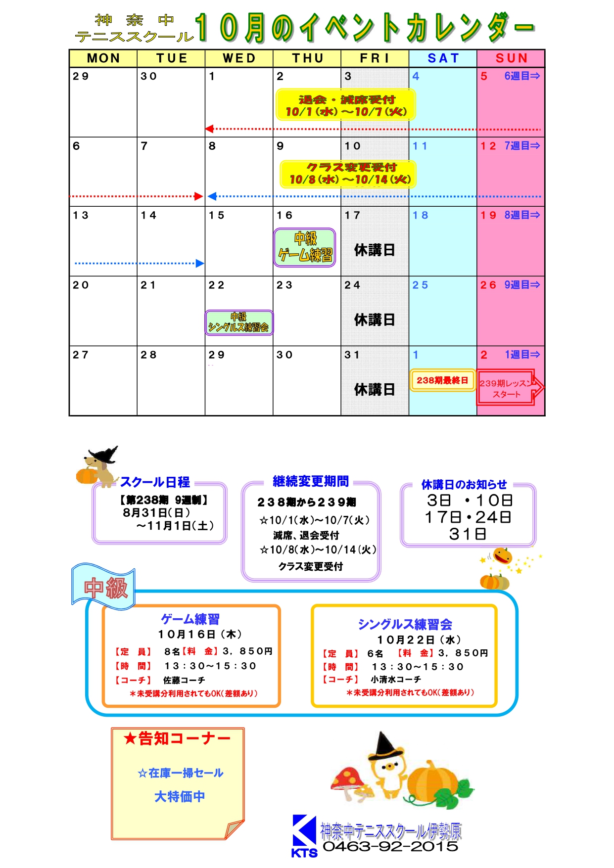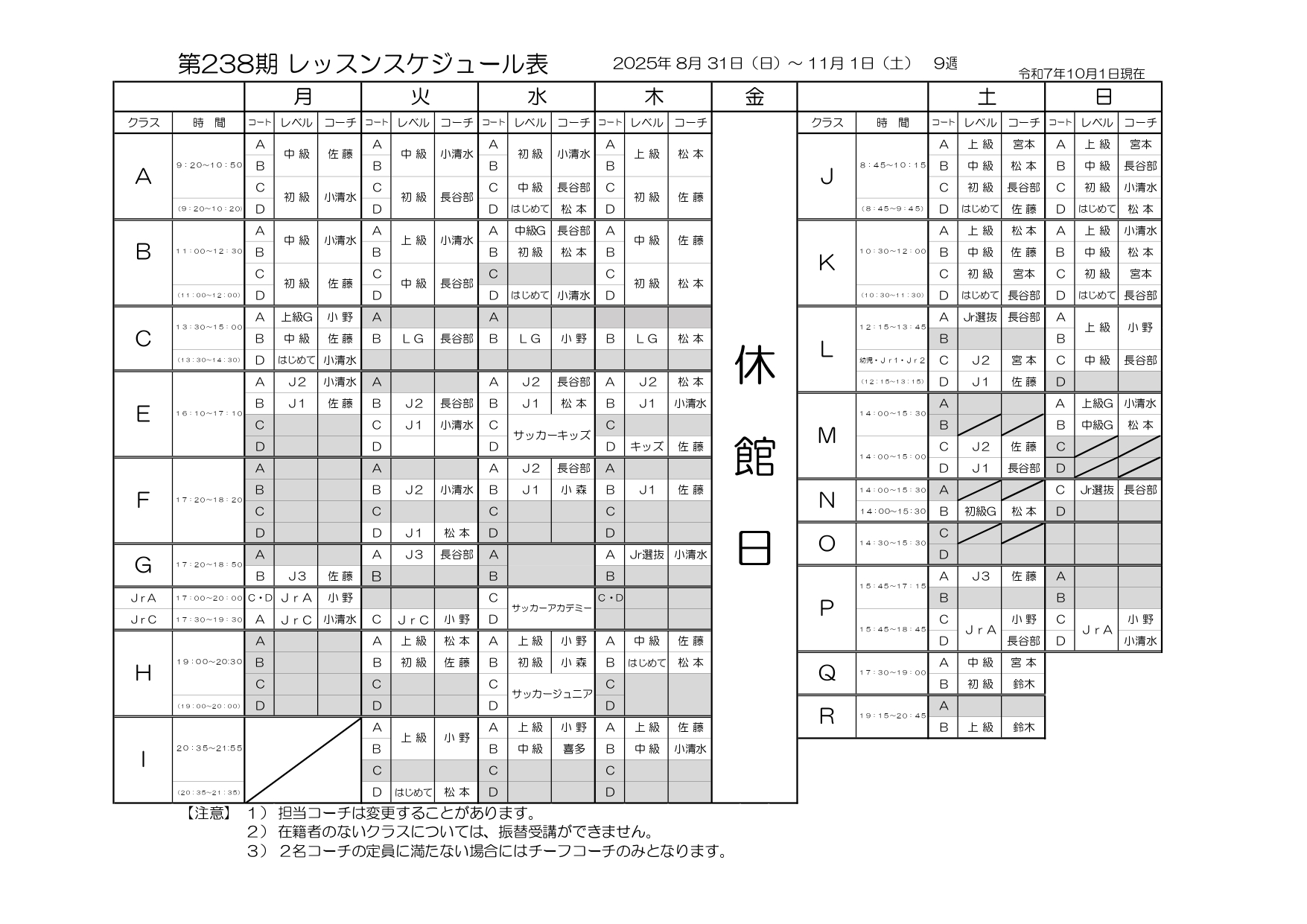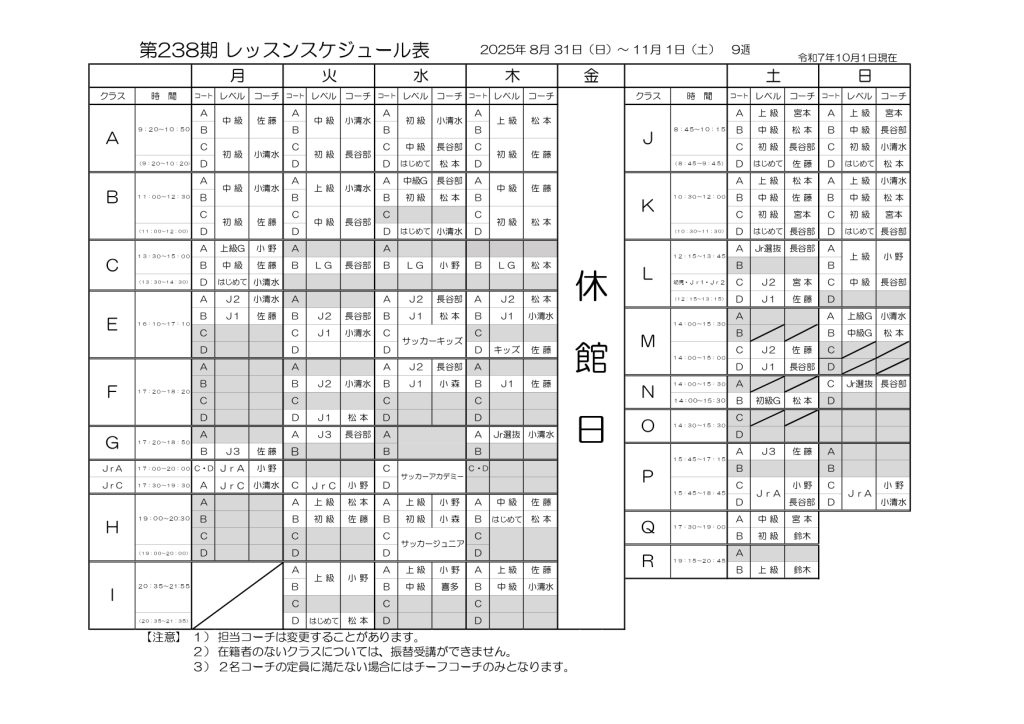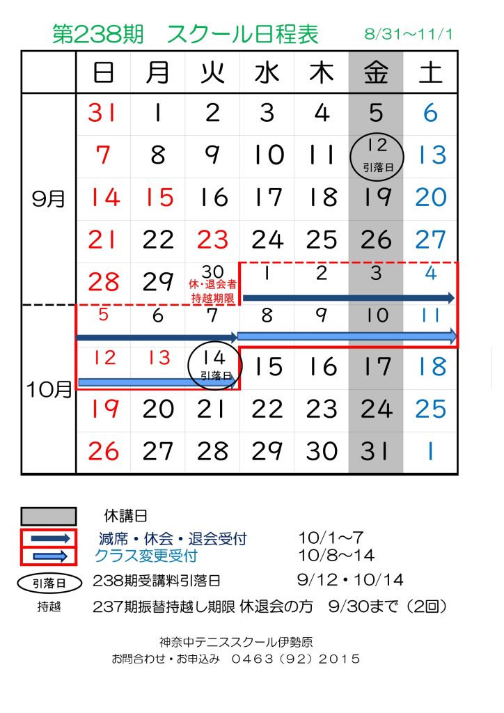 スケジュール 週間スケジュール 第238期レッスンスケジュール表 第期レッスンスケジュール表 第238期スクール日程表 第期スクール日程表 10月イベントカレンダー 年間スケジュール 2024年年間スケジュール お問合せはこちら